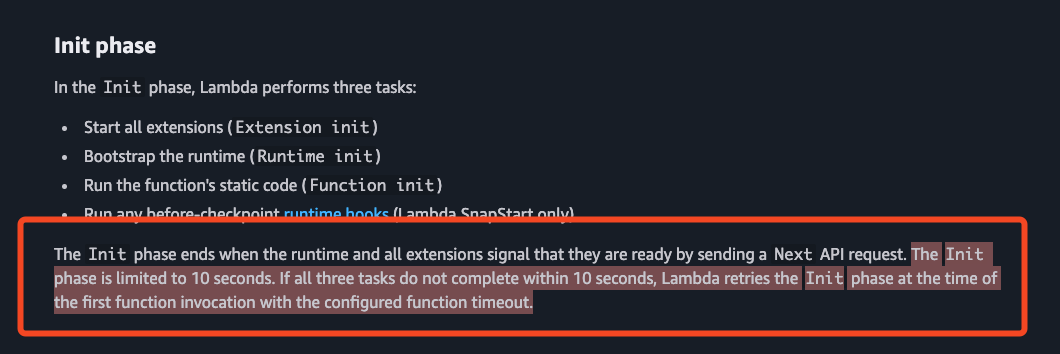 AWS Lambda는 기본적으로 Batch를 위해 있는 게 아니라 특정 이벤트가 발생했을 때 잠깐 깨어나서 계산을 처리하고 다시 잠드는 용도로 있습니다. 그렇기 때문에 당연히 빨리 깨어나서 일하고 다시 잠드는 특성을 가져야 해, 깨어나는 시간 즉 INIT을 10초로 제한하고 있습니다...